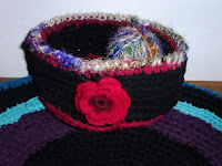 Brød eller frugtkurve hæklet af stofstrimler.